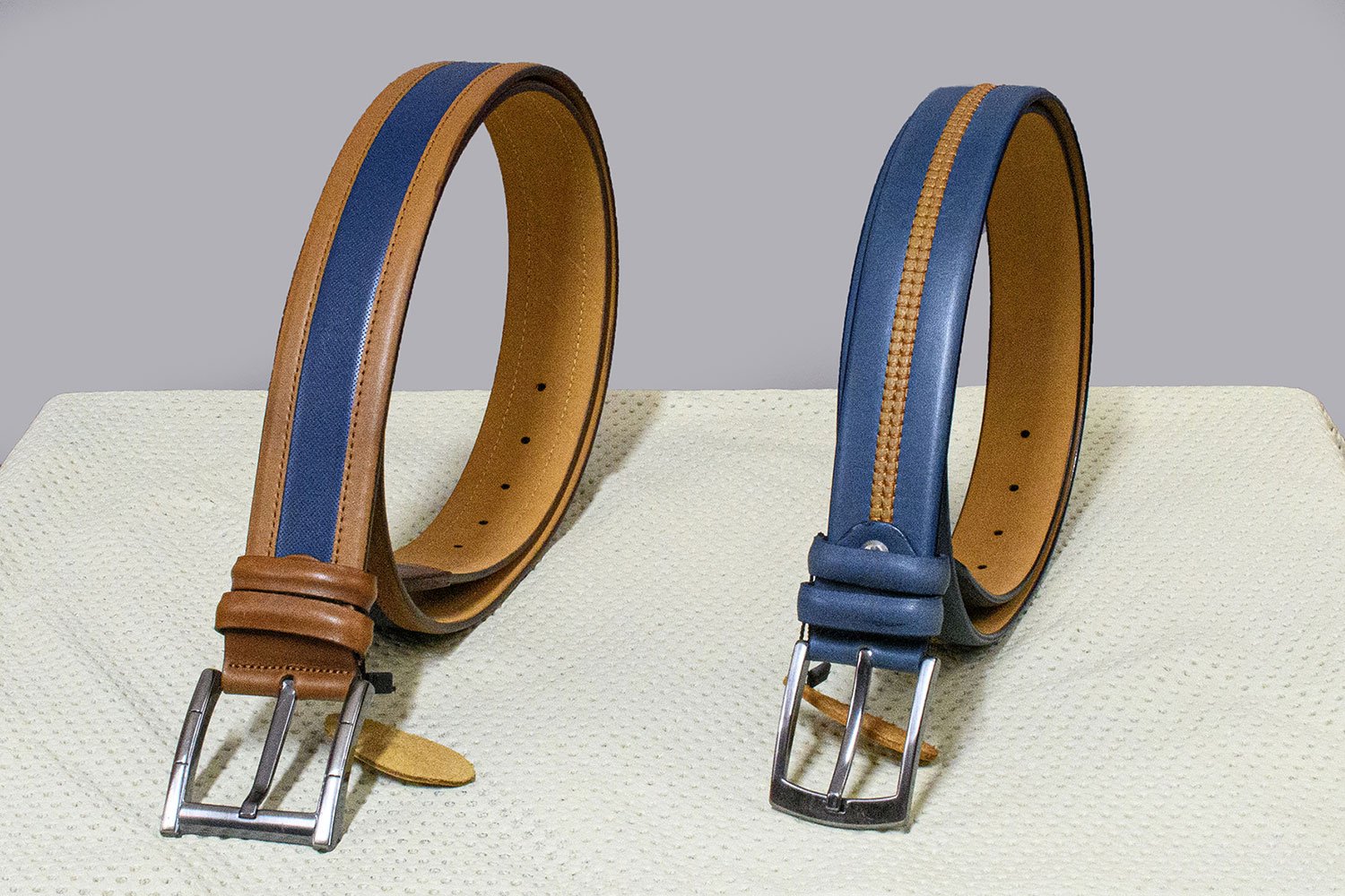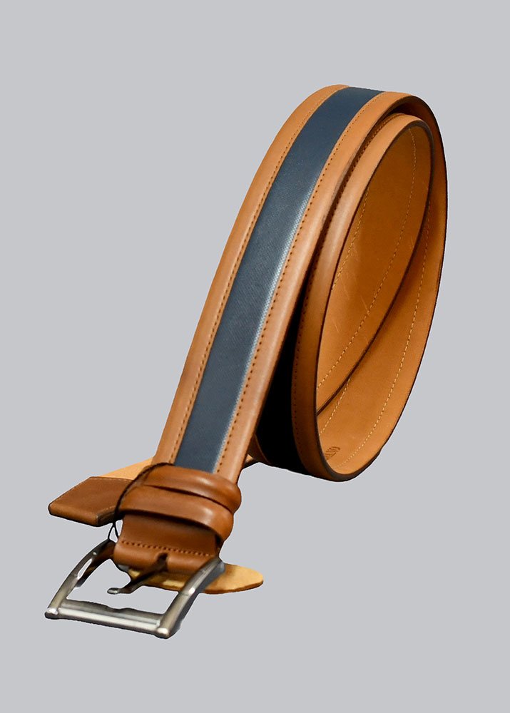Δερμάτινη ανδρική ζώνη MBL-002 με ταμπά ή μπλέ λεπτομέρειες και ασημένια αγκράφα κατάλληλη για σπορ ντύσιμο.