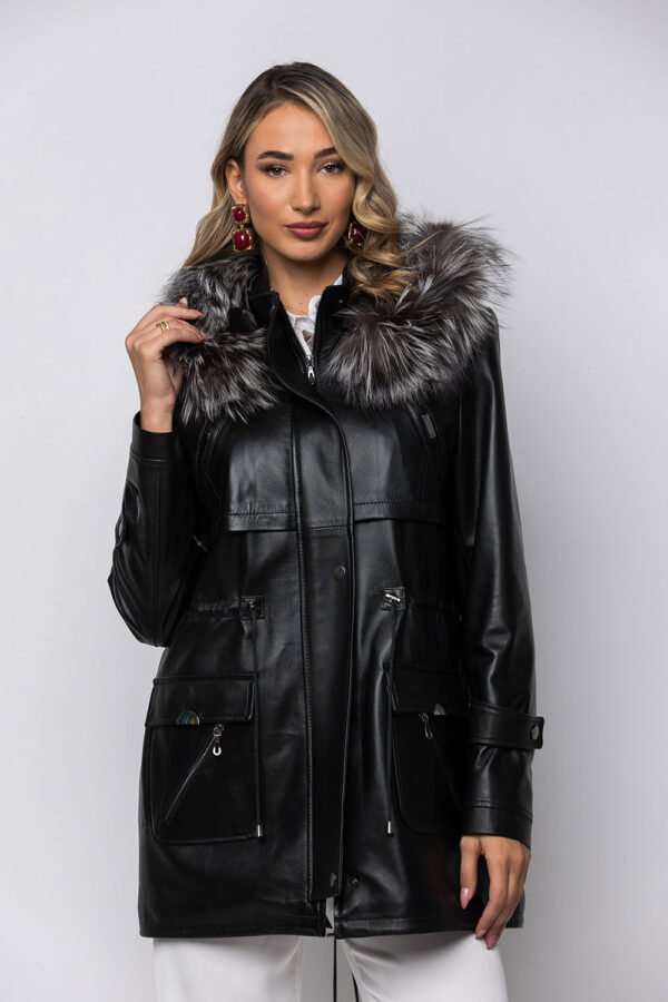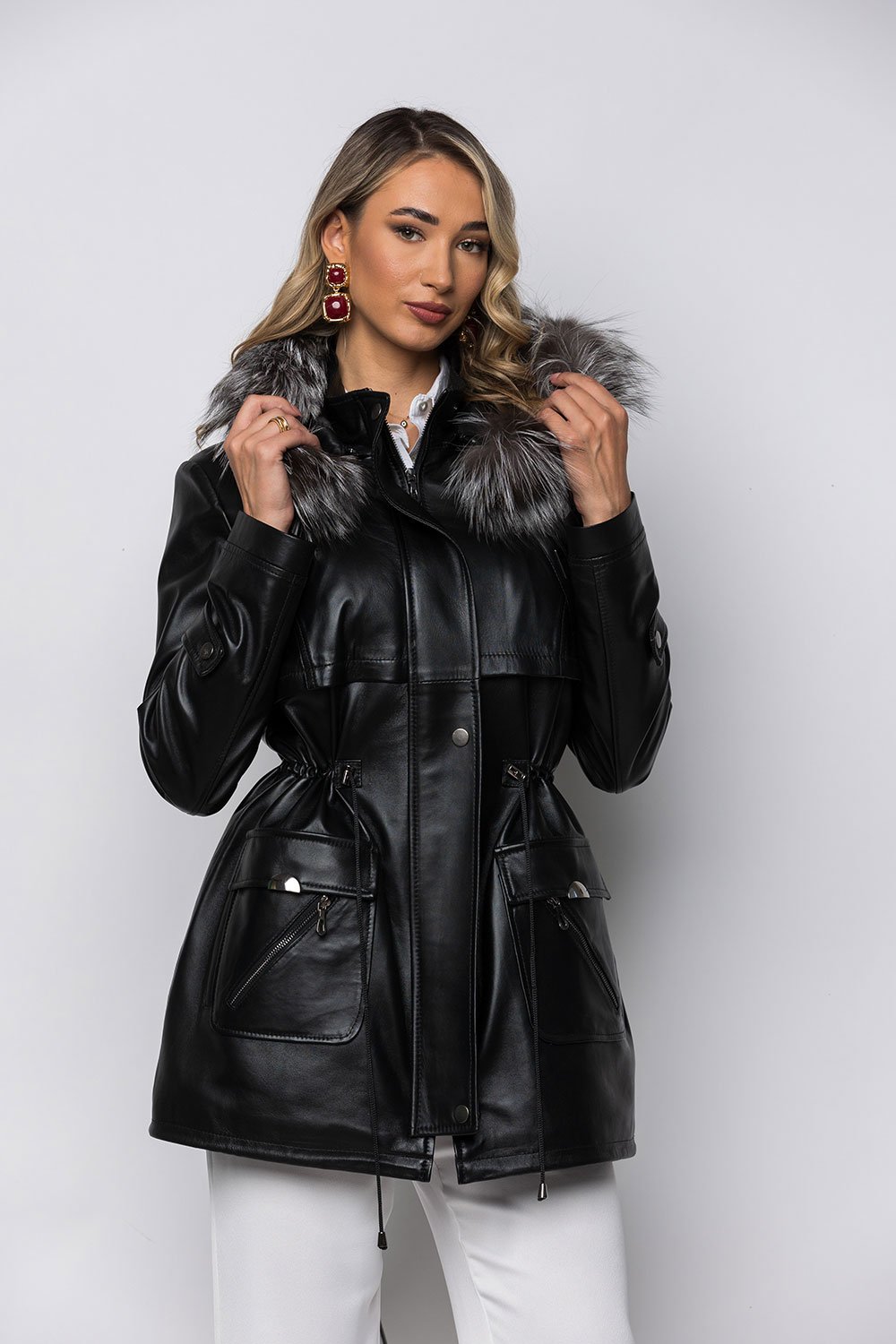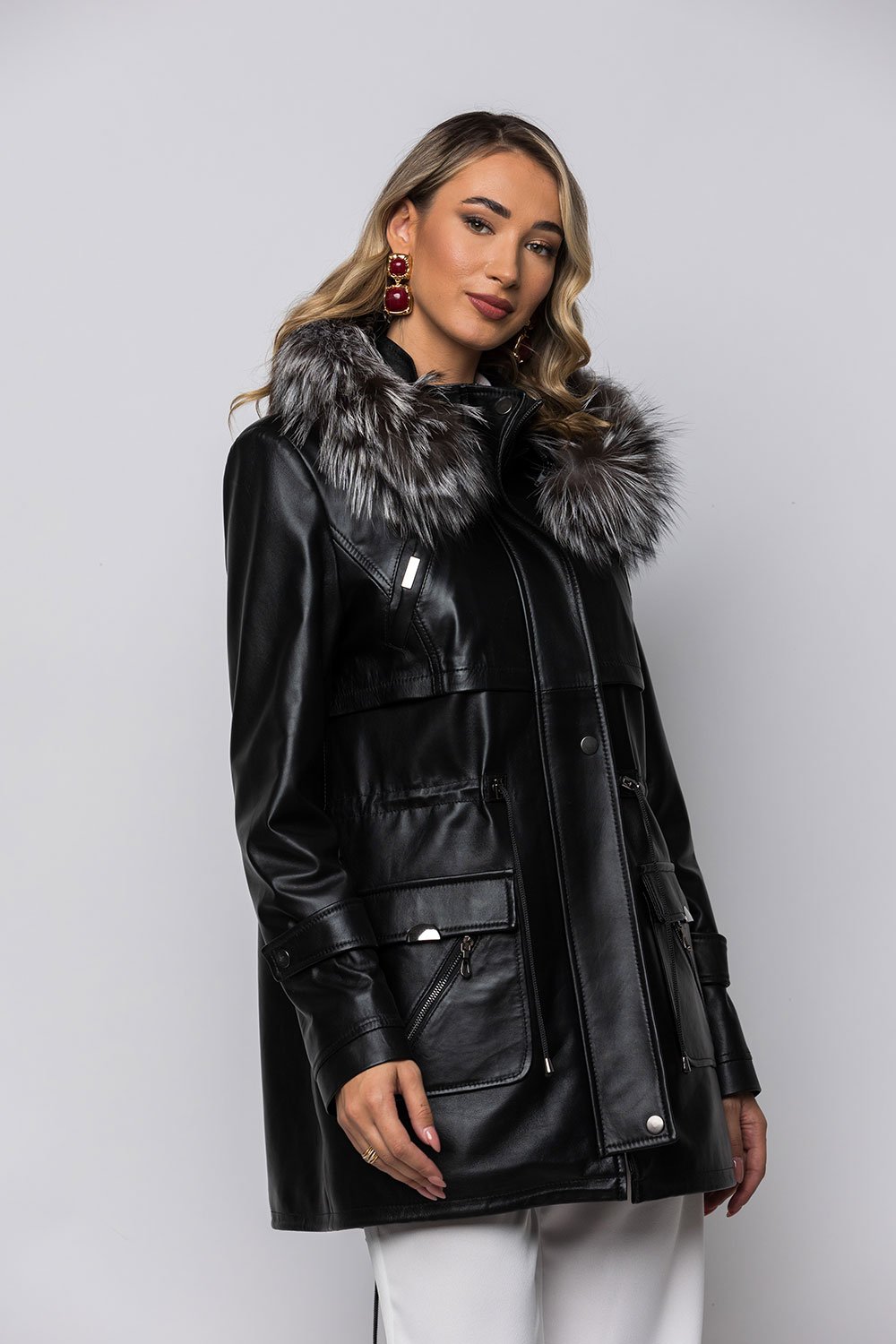 Δερμάτινη γυναικεία ζακέτα χρώματος μαύρη τύπου παρκ με αποσπώμενη κουκούλα και αποσπώμενη γούνα αρζαντέ στην κουκούλα από 100% μαλακό δέρμα αρνιού.
