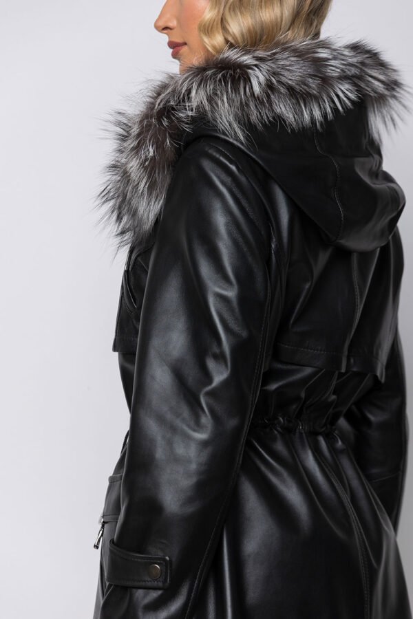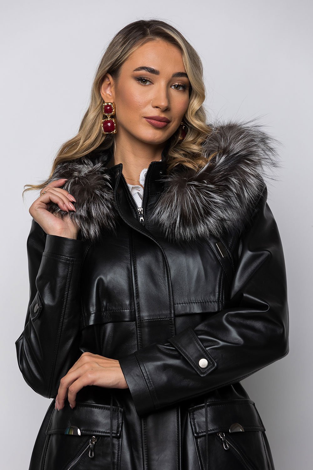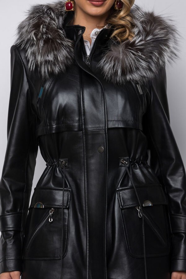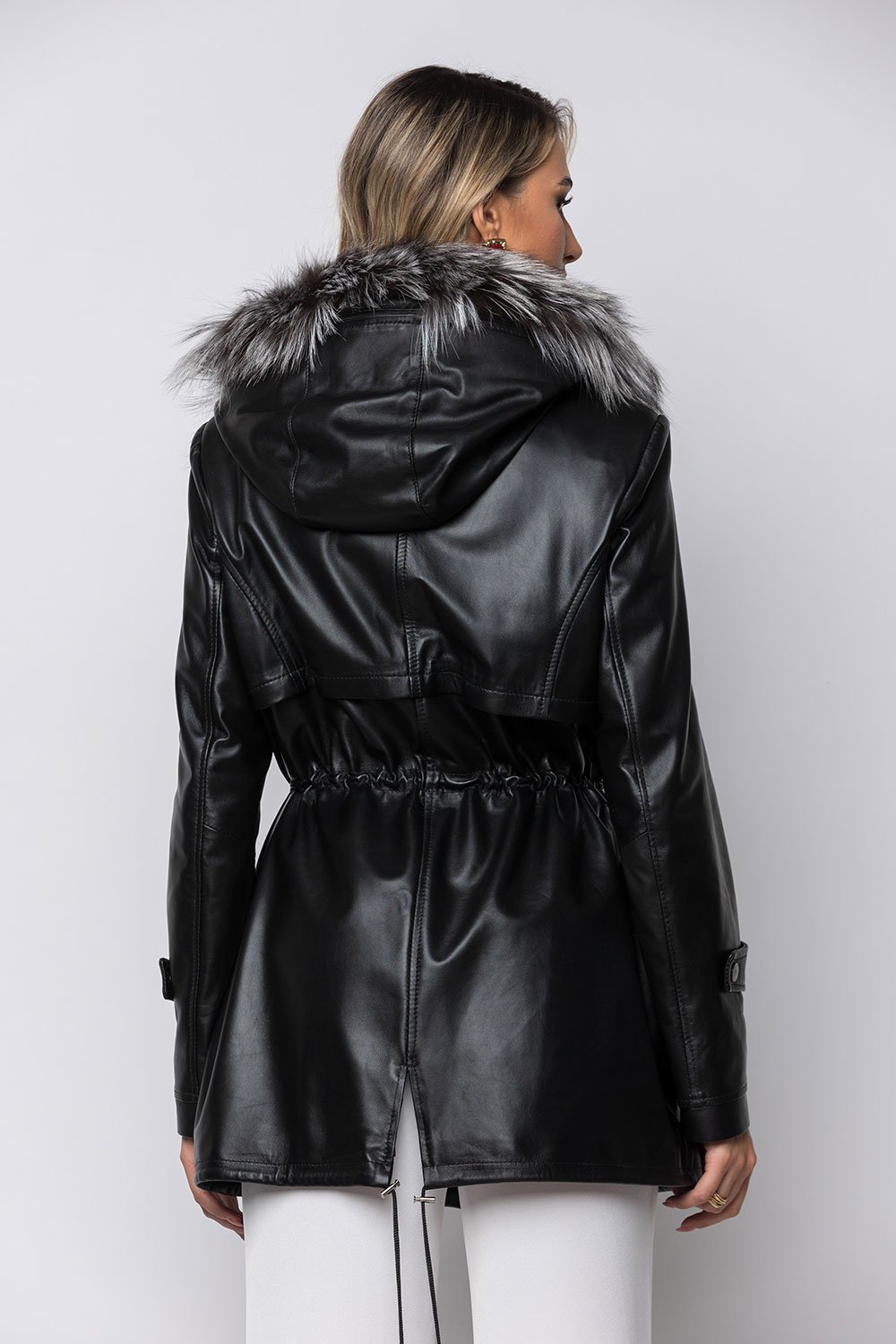 Δερμάτινη γυναικεία ζακέτα χρώματος μαύρη τύπου παρκ με αποσπώμενη κουκούλα και αποσπώμενη γούνα αρζαντέ στην κουκούλα από 100% μαλακό δέρμα αρνιού.