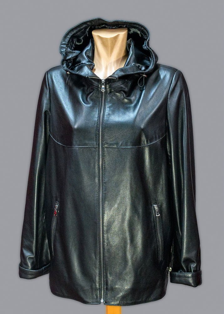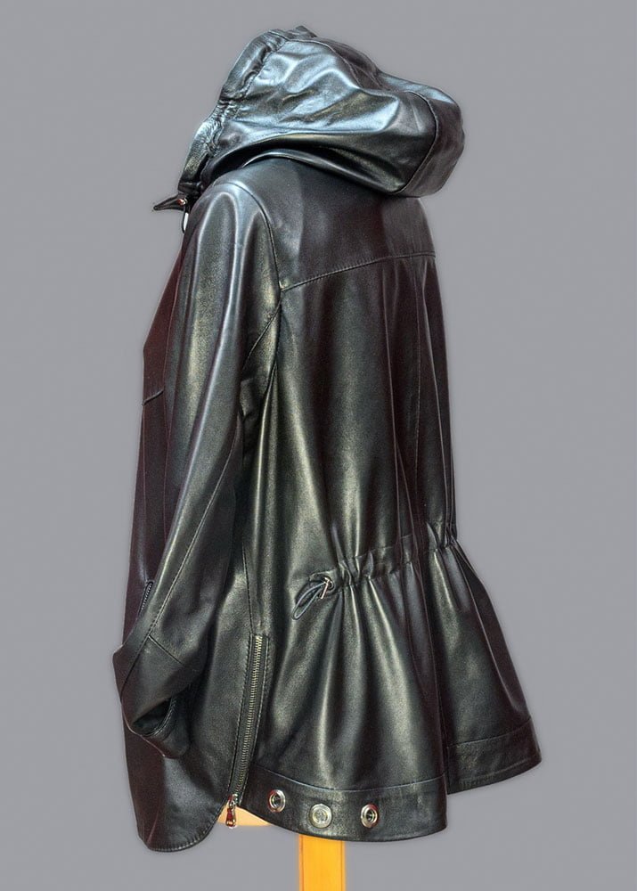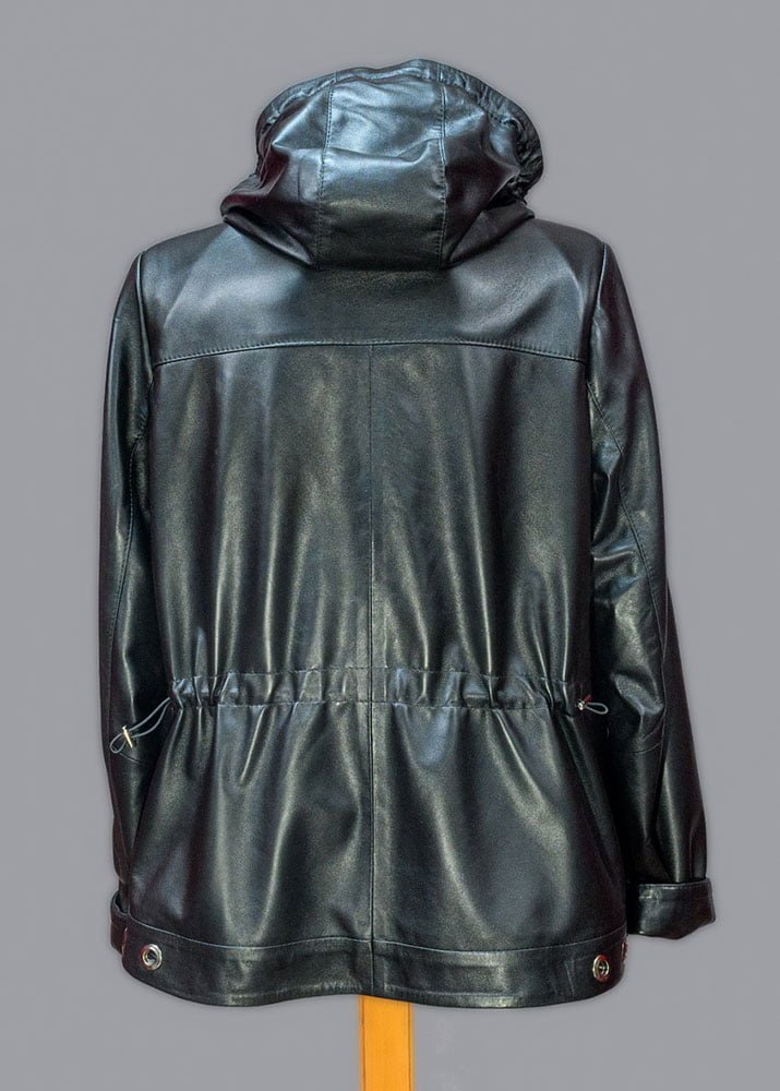 Δερμάτινη γυναικεία ζακέτα χρώματος μαύρο με κουκούλα και ρυθμιζόμενο κορδόνι στη μέση από 100% μαλακό δέρμα αρνιού σε επεξεργασία νάπα.