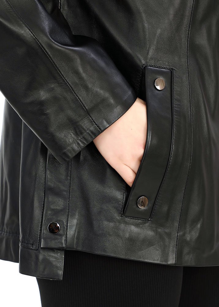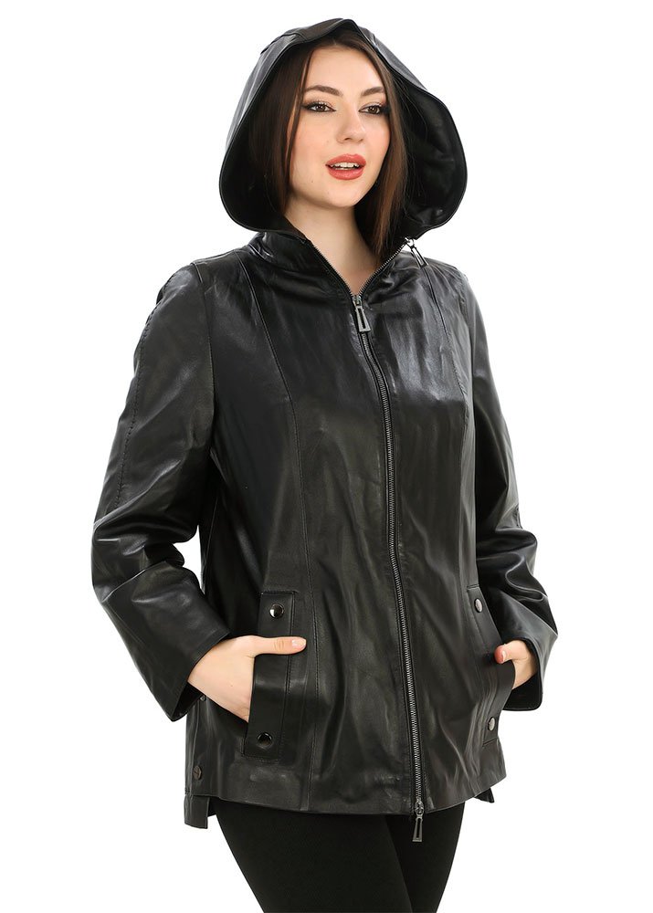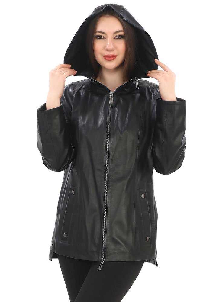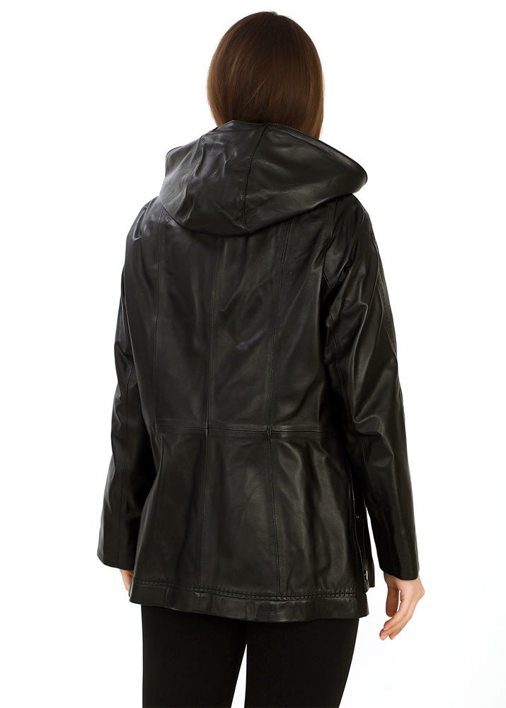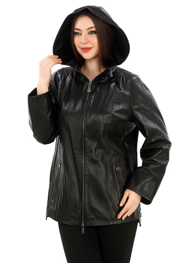 Δερμάτινη γυναικεία ζακέτα χρώματος μαύρο με λεπτομέρειες ίδιας απόχρωσης και κουκούλα αποσπώμενη μέσα έξω δέρμα, καθώς και κέντημα στο μανίκι και στον ποδόγυρο πίσω από 100% μαλακό δέρμα αρνιού.
