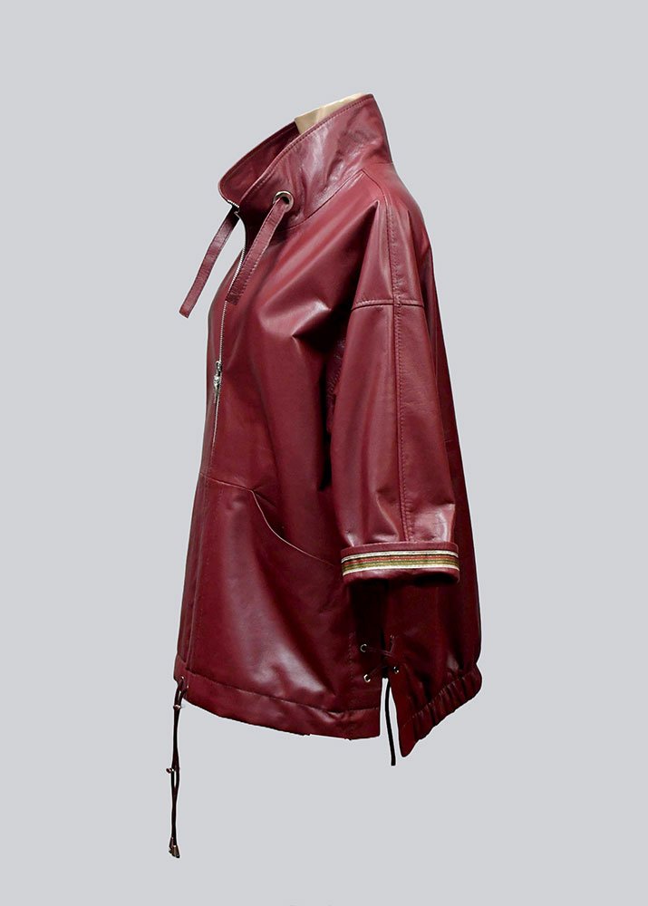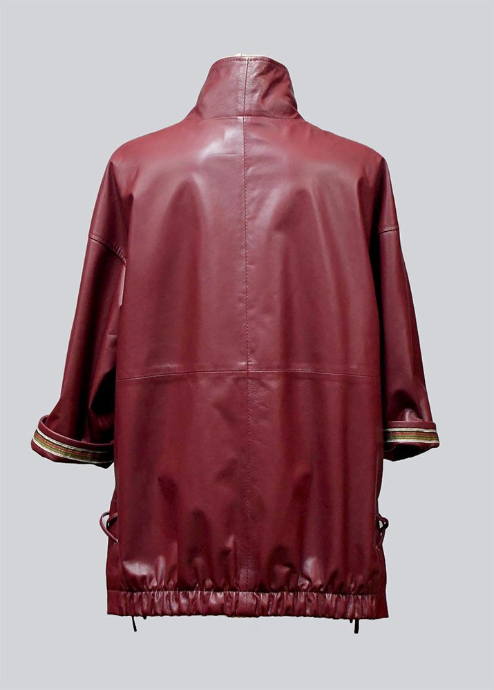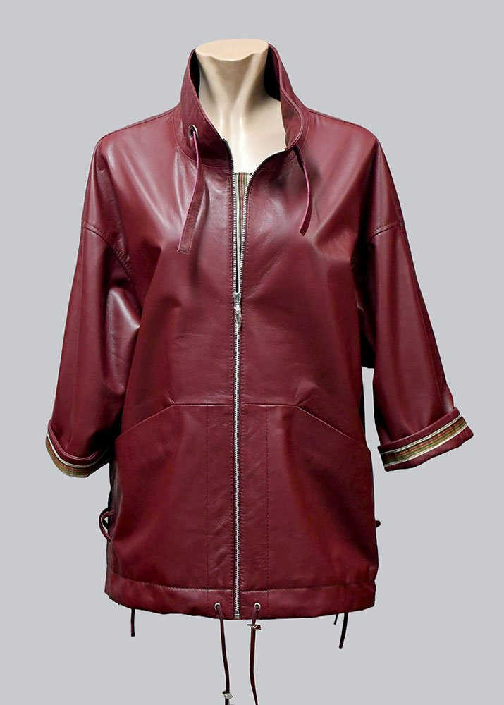 Δερμάτινη γυναικεία ζακέτα χρώματος μπορντό με τρέσα στο μανίκι και εσωτερική μόστρα από 100% μαλακό δέρμα αρνιού σε επεξεργασία νάπα.