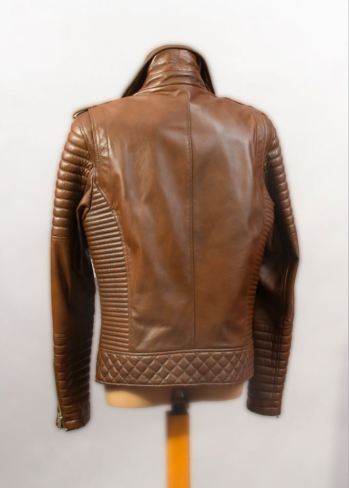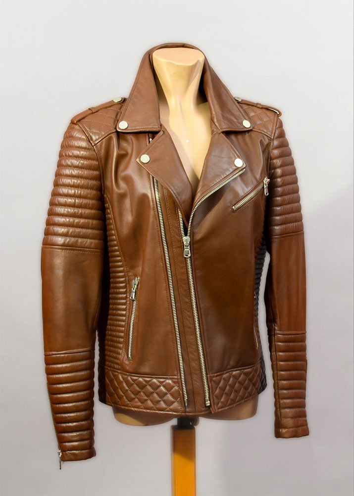 Δερμάτινο ανδρικό μπουφάν χρώματος antique τύπου bike με καπιτονέ λεπτομέρειες στα μανίκια, λοξό κούμπωμα και δυνατότητα να φορεθεί από δύο διαφορετικά μεγέθη λόγω του διπλού φερμουάρ, από 100% μαλακό δέρμα αρνιού σε επεξεργασία νάπα.