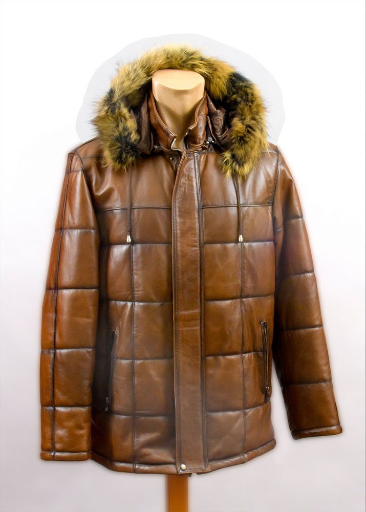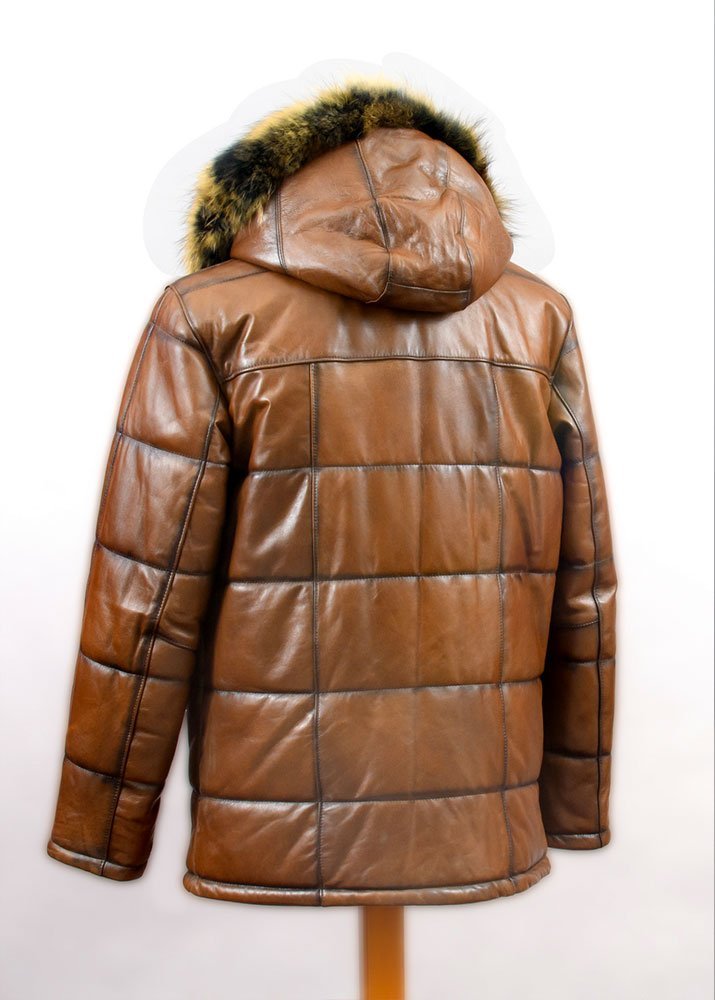 Δερμάτινο ανδρικό φουσκωτό τζάκετ χρώματος antique με αποσπώμενη κουκούλα περιμετρικά με γούνα από 100% μαλακό δέρμα αρνιού σε επεξεργασία νάπα.