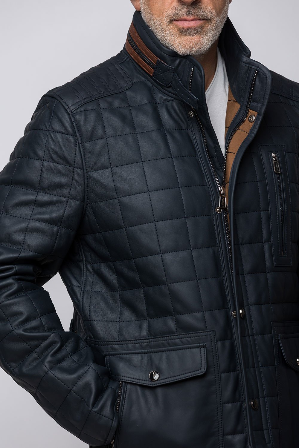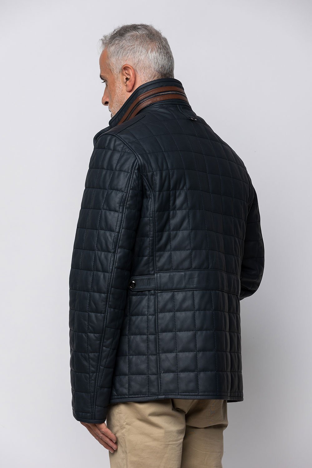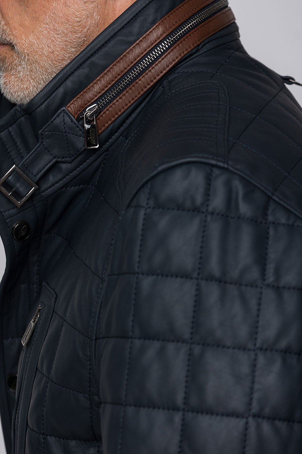 Δερμάτινο ανδρικό τζάκετ χρώματος blue black mat με καφέ λεπτομέρειες και καπιτοναρισμένο δέρμα από 100% μαλακό δέρμα αρνιού.