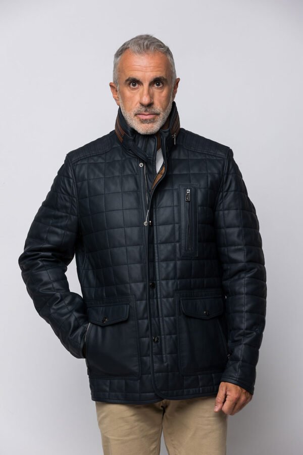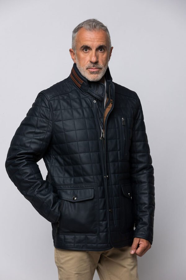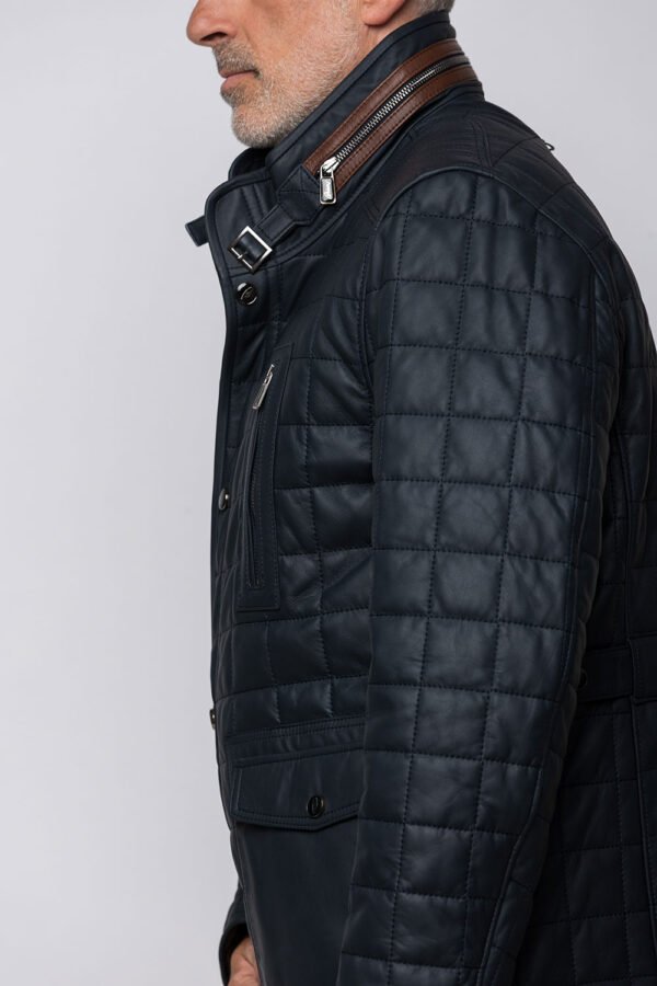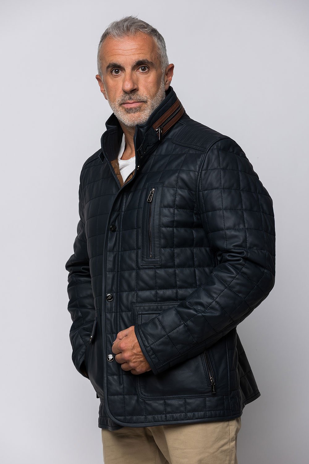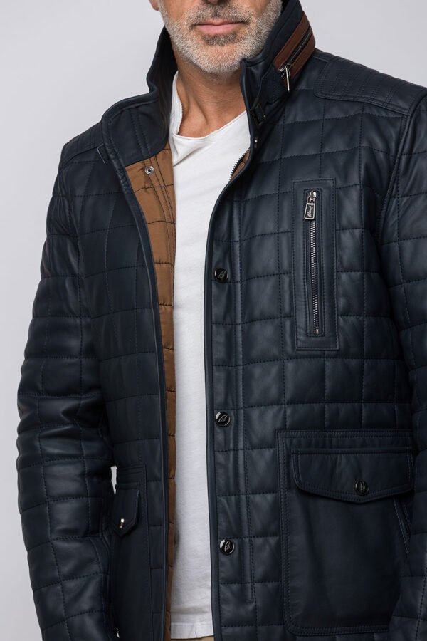 Δερμάτινο ανδρικό τζάκετ χρώματος blue black mat με καφέ λεπτομέρειες και καπιτοναρισμένο δέρμα από 100% μαλακό δέρμα αρνιού.
