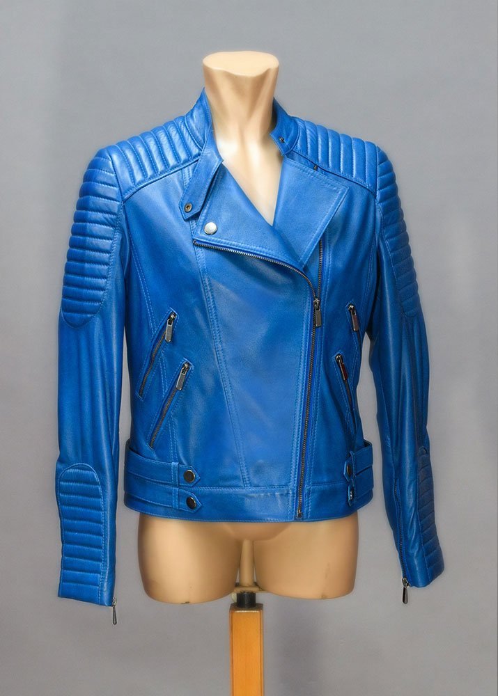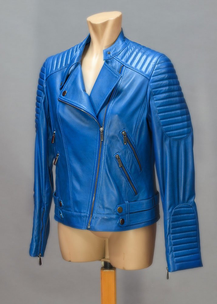 Δερμάτινο γυναικείο μεσάτο μπουφάν χρώματος μπλε τύπου bike με καπιτονέ λεπτομέρειες στα μανίκια και στον ώμο από 100% μαλακό δέρμα αρνιού σε επεξεργασία νάπα.