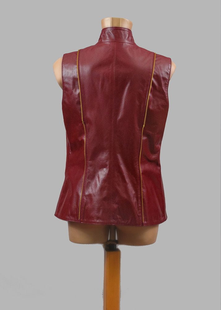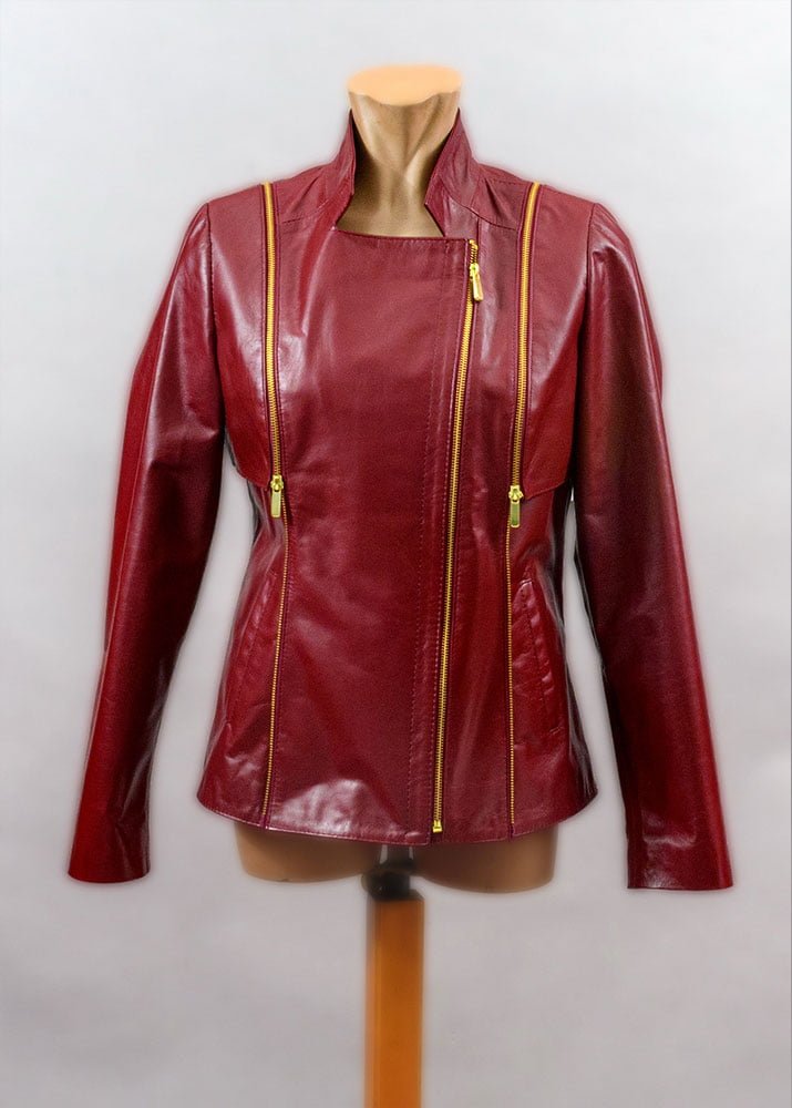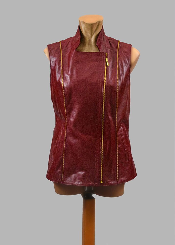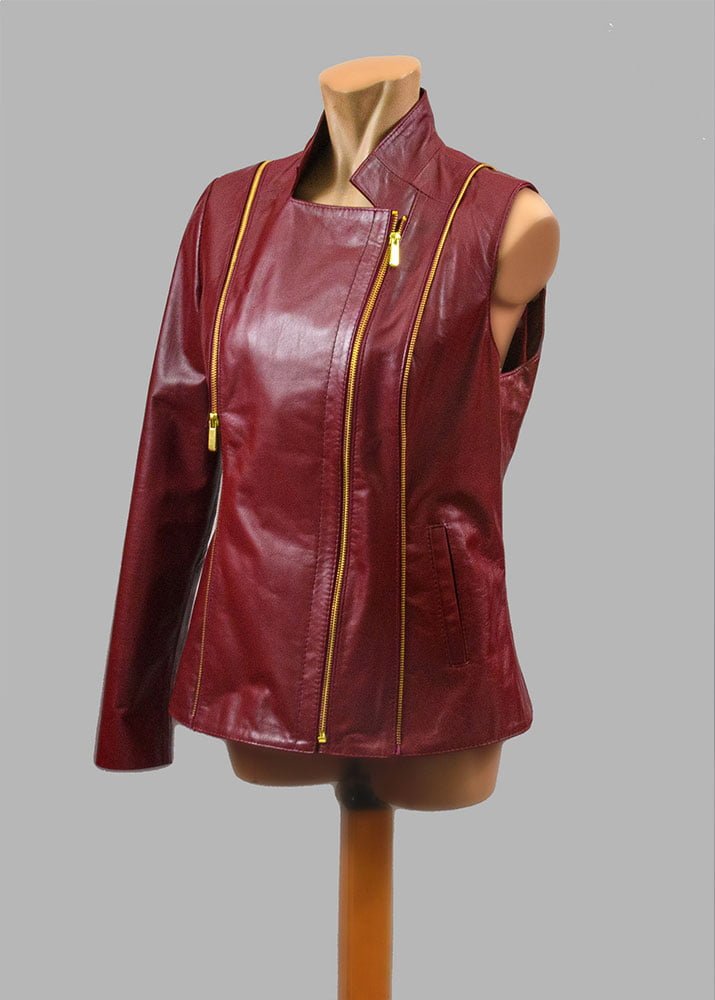 Δερμάτινο γυναικείο μεσάτο μπουφάν χρώματος μπορντό με δυνατότητα να φορεθεί και σαν γιλέκο λόγω του ότι αποσπώνται τα μανίκια από 100% μαλακό δέρμα αρνιού σε επεξεργασία νάπα.